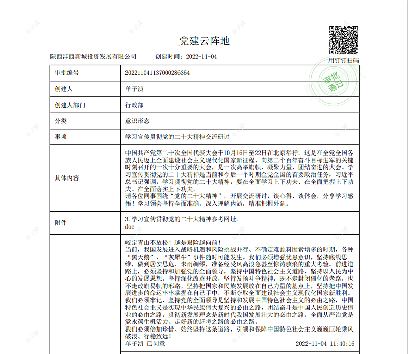 “我來說說黨的二十大報告里的關鍵詞—‘團結’,團結奮斗是我們黨過去取得成功、現在爭取成功、將來繼續成功的寶貴經驗,是中國共產黨百年光輝歷程的主旋律,”這是灃西投資黨支部在釘釘黨建云平臺上發起的一場二十大理論“微宣講”活動的交流討論。“微宣講”是創新宣講活動的一次有益嘗試,灃西投資黨支部不斷拓寬宣講渠道,在鞏固宣講人員線下+多媒體宣講的前提下,發揮網絡渠道宣講不受時間、地點限制的優勢。除線下面對面、點對點宣講外,在釘釘黨建云平臺、微信交流群發起系列宣講學習交流討論活動,不斷擴大宣講覆蓋范圍和感染力,讓大家能入腦、入心、可落實、聚人氣。