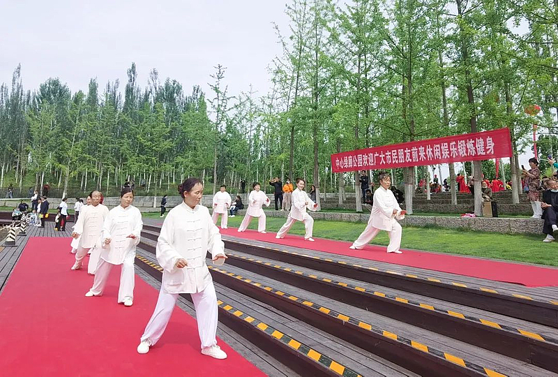 園內枝頭梢末,花兒們正鉚足勁兒爭相吐艷,在交流表演現場,廣場舞、太極拳、舞龍隊的精彩表演引得陣陣喝彩和熱烈掌聲。
