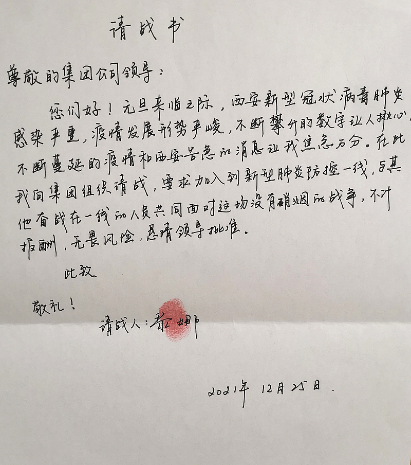 “本人居住小區未被封控,可以保證正常通勤,我向組織請戰,要求做一線防疫、供暖保障人員,無畏風險、不計報酬!”這是一名80后員工,她叫王川,是灃西集團下屬子公司能源公司的一名員工,在防疫工作開始后,她一貫沖在前干在前,值班時總是要求第一班。為了讓其他同事可以休息,可以輪休的情況下依然堅持每天到公司到崗上班,保證工作不斷檔。公司在防疫執勤點排班時主要安排男同志,但身為女同志,她多次申請前往一線。12月27日,在全市新一輪核酸檢測行動開始前,王川同志主動手寫請戰書,再次要求到一線防疫!目前在灃西新城馬王村開展防疫工作。