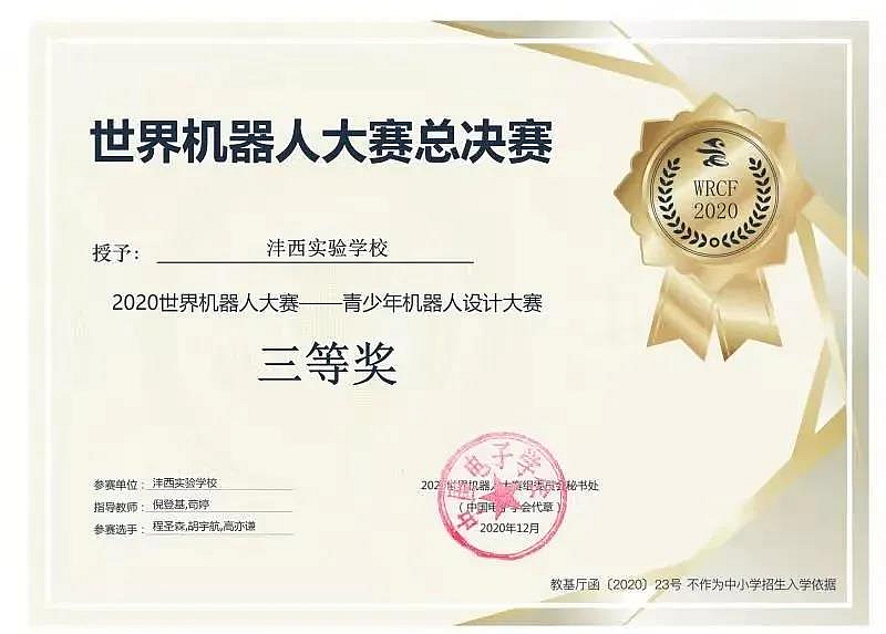 2020年12月,灃西實驗學校八年級學生胡宇航、程圣森、高奕謙榮獲2020世界機器人大賽總決賽三等獎。