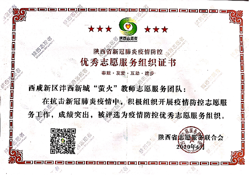 2020年年初,面對來勢洶洶的疫情,灃西一小與灃西三小迅速組建一小、三小教育共同體“螢火”教師志愿服務團隊,為奮戰(zhàn)在一線的醫(yī)護人員子女用知識傳遞溫暖,用教育的光芒助力疫情防控阻擊戰(zhàn)。2020年6月,灃西新城“螢火”教師志愿服務團隊榮獲陜西省抗擊新冠肺炎疫情優(yōu)秀志愿服務組織。