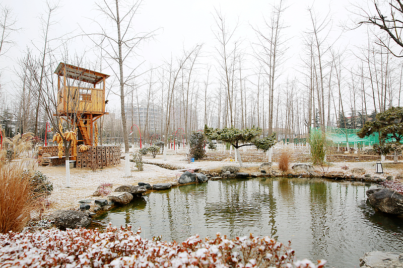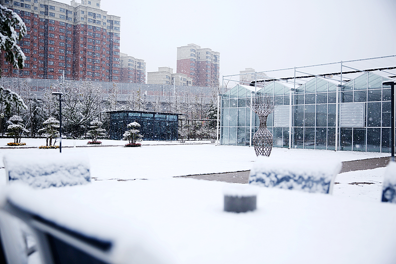 靈動淡雅、寧靜通幽。極簡的色彩、瀟灑寫意的線條,雪中的園區(qū),好似一幅水墨畫。風(fēng)聲梢捎,平添幾分生動與靈性。