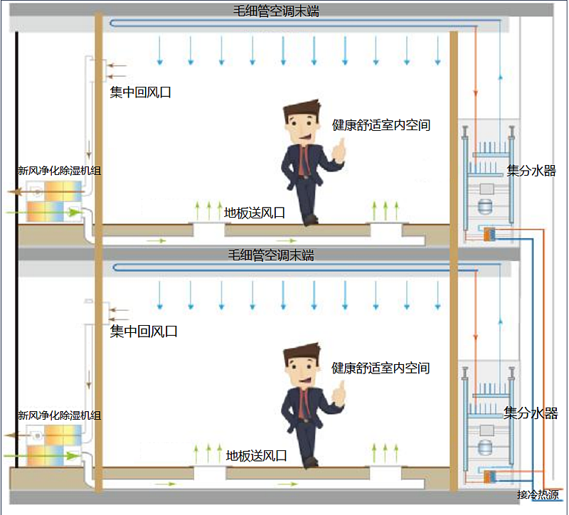 利用中深層地熱能供熱的同時,升級應用清潔能源3.0模式,集合新風系統、儲能技術、生態空調為一體,以輻射為主、對流為輔,實施頂地供暖供冷,配合除濕、加濕空氣處理系統,外設冷卻塔制冷,結合毛細管網敷設,保證全年室內溫度冬季大于等于20°C,夏季小于等于26°C。采用地送頂回的24小時置換式新風循環系統,利用離子瀑凈化技術,空氣經過多級過濾送入室內,確保室內含氧量恒定,CO2濃度小于500ppm,濕度保持在40%-60%之間,pm2.5過濾大于95%,保證室內環境舒適健康。