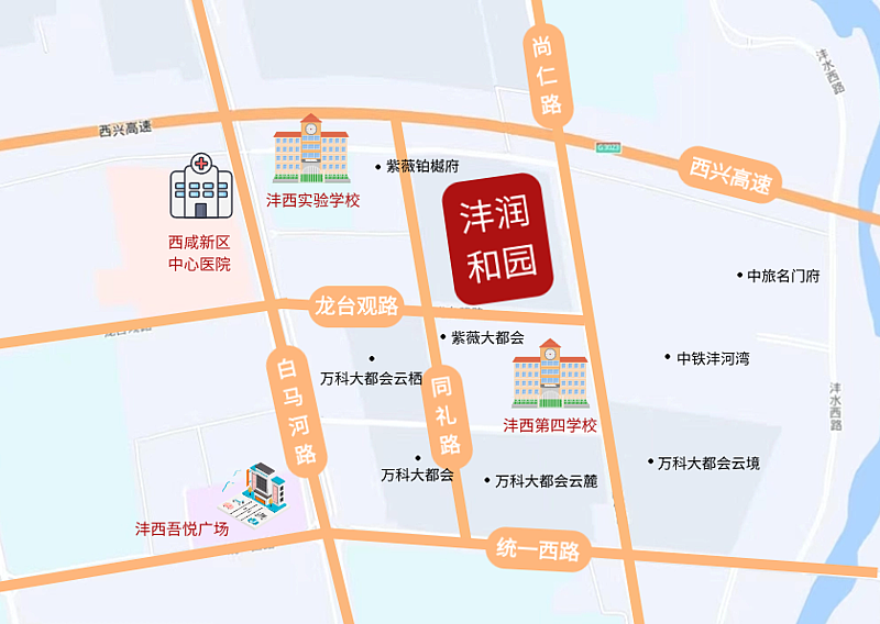 周邊市場:作為灃潤和園小區配套底商,周邊1-2公里內小區住宅密集,西側有西咸新區中心醫院、灃西實驗學校,南側為灃西第四學校,區域人口基數大,商業開發成熟度較高。