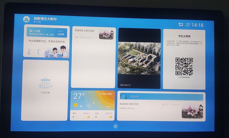 智慧教育應(yīng)用方面,采用了云端與線下“雙模”的形式,將班級(jí)門(mén)前電子班牌與教室內(nèi)電子白板有機(jī)互聯(lián),具備“家校留言互動(dòng)”“信息快速發(fā)布”“查詢課表”“學(xué)生考勤管理”“班風(fēng)文化展示”等多種功能。
