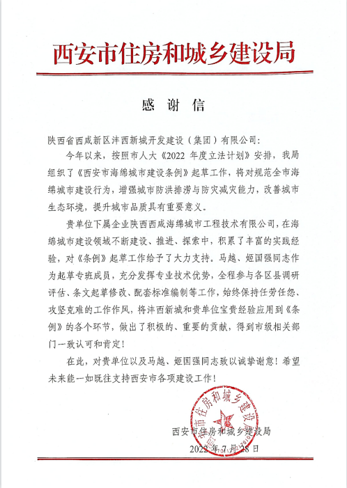 近日,灃西集團(tuán)收到一封來(lái)自西安市住房和城鄉(xiāng)建設(shè)局的感謝信,信中對(duì)集團(tuán)下屬企業(yè)陜西西咸海綿城市工程技術(shù)有限公司協(xié)助編制《西安市海綿城市建設(shè)條例》過程中展現(xiàn)出的專業(yè)水平與職業(yè)素養(yǎng)表示高度認(rèn)可與贊揚(yáng)。感謝信指出,作為《西安市海綿城市建設(shè)條例》起草專班團(tuán)隊(duì),海綿城市技術(shù)公司充分發(fā)揮實(shí)踐經(jīng)驗(yàn)豐富、專業(yè)技術(shù)領(lǐng)先等優(yōu)勢(shì),全程參與各區(qū)縣調(diào)研評(píng)估、條文起草...