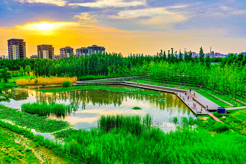 今年八九月間,整個陜西都普遍多雨,和一些城市動輒“坐著小船去看海”截然不同的是,灃西新城大街小巷、街頭廣場、公園幽徑始終都不曾見到積水的蹤跡。在這里,傳統(tǒng)地下排水管網(wǎng)被綠廊、植草溝、蓄水花園、下凹式綠地等替代,市政道路和城市主次干道利用技術創(chuàng)新使硬化路面更具透水性。雨天時,雨水通過下凹式綠化帶、雨水花園等逐級被消納,多余的雨水,則順雨水管渠流向灃西新城中心區(qū)域的中央公園,確保整個城市“小雨不積水,大雨不內(nèi)澇”。