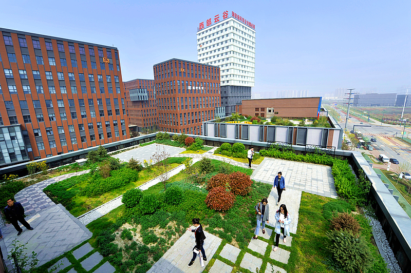 “上樓去散散步吧。”在快節(jié)奏的現(xiàn)代社會,很多被困于城市寫字樓內(nèi)的白領,每天工作間歇最大的奢望,便是下樓找一塊綠地放松放松。然而,在灃西新城西部云谷,白領們只需移步樓頂,便能瞬間完成辦公室到公園的無縫切換。作為建設海綿城市的重要探索,近年來,灃西新城部分園區(qū)辦公樓上建設了綠色屋頂。屋頂花園不僅能起到吸收、凈化雨水的作用,同時還能有效減碳吸碳,降霾去熱,成為城市一道稀有景觀。