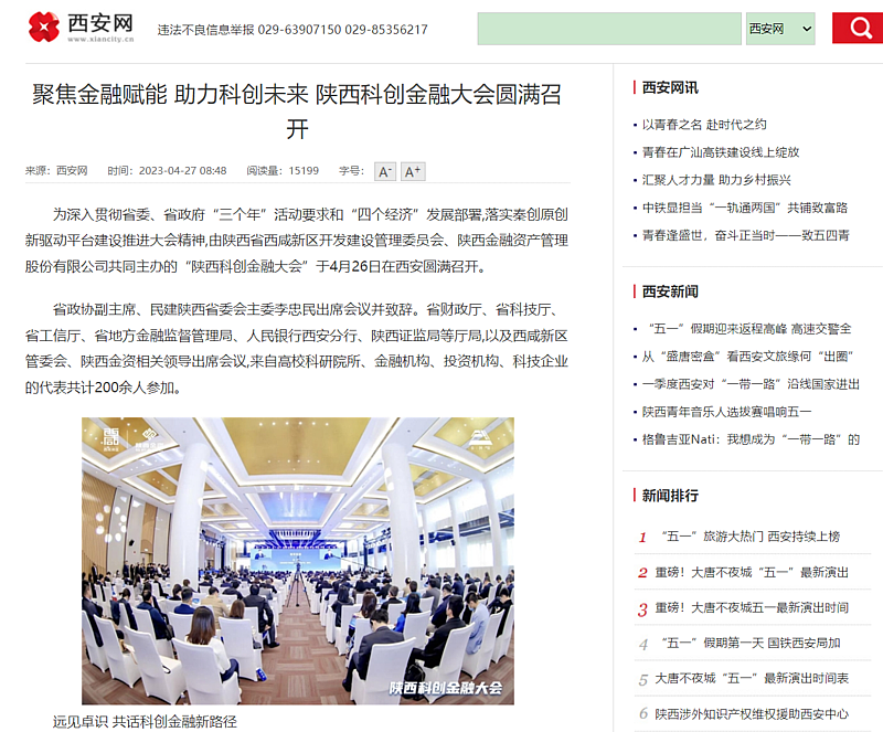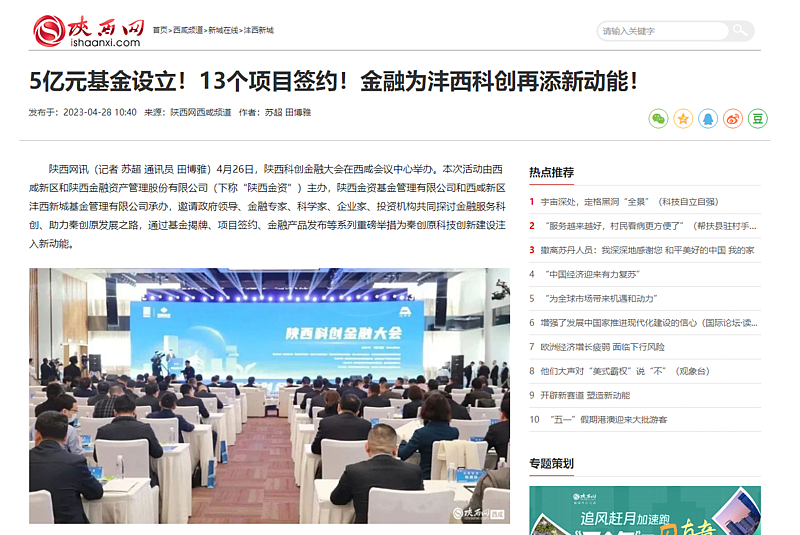 4月26日,陜西科創(chuàng)金融大會在西咸會議中心舉辦。本次活動由西咸新區(qū)和陜西金融資產(chǎn)管理股份有限公司(下稱“陜西金資”)主辦,陜西金資基金管理有限公司和西咸新區(qū)灃西新城基金管理有限公司承辦,邀請政府領導、金融專家、科學家、企業(yè)家、投資機構(gòu)共同探討金融服務科創(chuàng)、助力秦創(chuàng)原發(fā)展之路,通過基金揭牌、項目簽約、金融產(chǎn)品發(fā)布等系列重磅舉措為秦創(chuàng)原科技創(chuàng)新建設注入新動能。