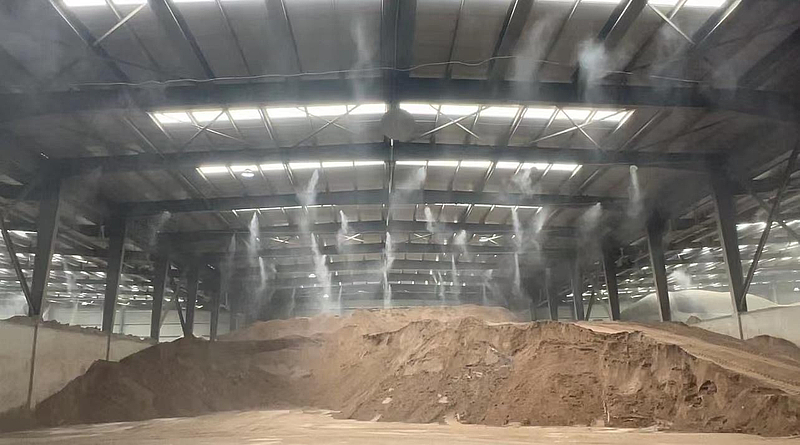 正如姚曉東所言,記者在廠區(qū)內(nèi)轉(zhuǎn)了一圈,只看見(jiàn)一輛輛裝成品混凝土的車(chē)輛,卻始終難覓混凝土生產(chǎn)線的影子。直到一輛突然出現(xiàn)的裝載機(jī),觸發(fā)自動(dòng)識(shí)別系統(tǒng)“打開(kāi)”一個(gè)“大房子”的大門(mén),記者跟隨機(jī)械進(jìn)入,才看到了成堆的砂石料。只見(jiàn)房頂密密麻麻安置的噴霧裝置,正在循環(huán)工作降塵,此處就是存儲(chǔ)砂石料的料倉(cāng)。