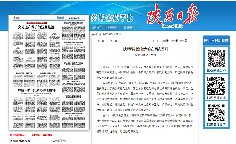 4月26日,陜西科創(chuàng)金融大會(huì)在西咸會(huì)議中心舉辦。本次活動(dòng)由西咸新區(qū)和陜西金融資產(chǎn)管理股份有限公司(下稱“陜西金資”)主辦,陜西金資基金管理有限公司和西咸新區(qū)灃西新城基金管理有限公司承辦,邀請政府領(lǐng)導(dǎo)、金融專家、科學(xué)家、企業(yè)家、投資機(jī)構(gòu)共同探討金融服務(wù)科創(chuàng)、助力秦創(chuàng)原發(fā)展之路,通過基金揭牌、項(xiàng)目簽約、金融產(chǎn)品發(fā)布等系列重磅舉措為秦創(chuàng)原科技創(chuàng)...
