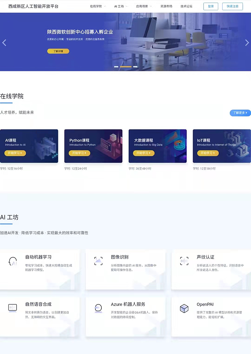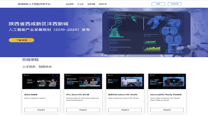 西咸新區人工智能開放平臺項目由集團公司二級子公司陜西微軟創新中心有限公司于2019年1月開始進行建設,2020年9月完成上線。平臺服務于我省高校、科研機構、開發型初創企業、政府、垂直領域各行業,提供人工智能方向教學及認證考試、...[更多]